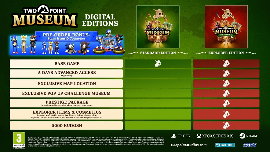 If you prefer just the standard edition, pre-ordering that will also net you the Sonic-themed collection of items including Sonic and Shadow staff outfits, guest gift shop outfits and plushies for museum guests to purchase. Bonus museum customisation options will also feature Sonic wallpaper, flooring and decorative statues.